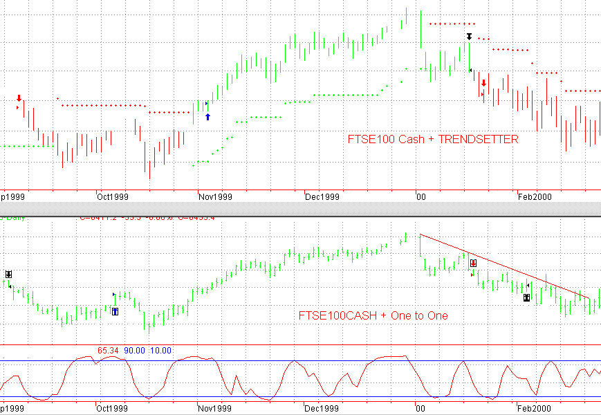 demonstrate how the two charts on the same time base may be The upper chart also shows the 'Support 'and 'Resistance' lines ,which are used in both Buying and Writing options , note the accuracy of these levels and when they are finally broken that the main signal either changes direction immediately or there is a consolidation signal for a short while before the change in direction is established, as occurred in January. Notice also ,in this instance, that the two signals were in support of each other within two days. The 'RH Paint Bar Indicator' ,which is based on different concepts, has also been applied to the upper chart and demonstrates how the price bar changes colour to give an additional warning of a possible change in direction. The change in colour of the price bar is not always followed by a change in the main signal due to prevailing conditions but due consideration must still be given to it. The use of these indicators is described together with explanatory diagrams in the system documentation.